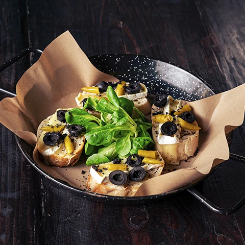 papryczka guindillas, camembert, czarna oliwka